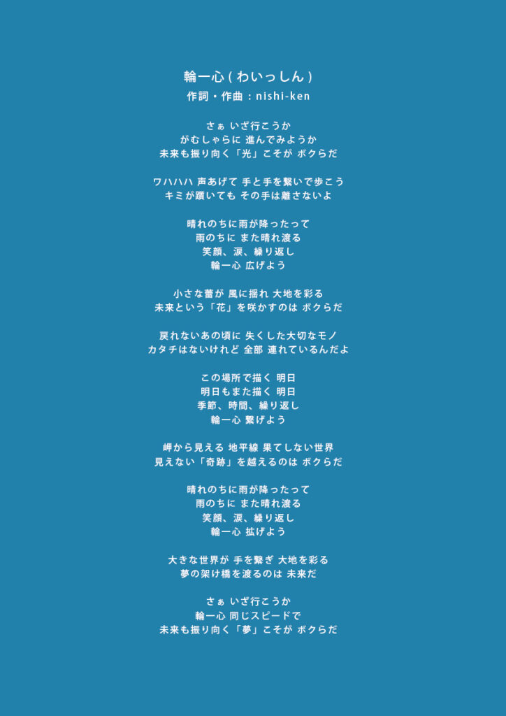 輪島市社会福祉協議会の児童クラブに通う子どもたち70名にアンケートを実施。その純粋な想いを大切に、石川県出身の音楽プロデューサー・nishi-kenがオリジナル楽曲を書き下ろしました。